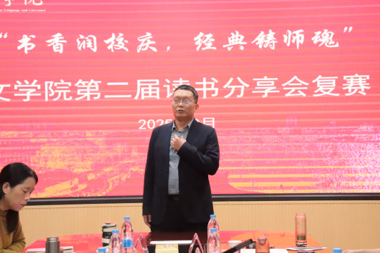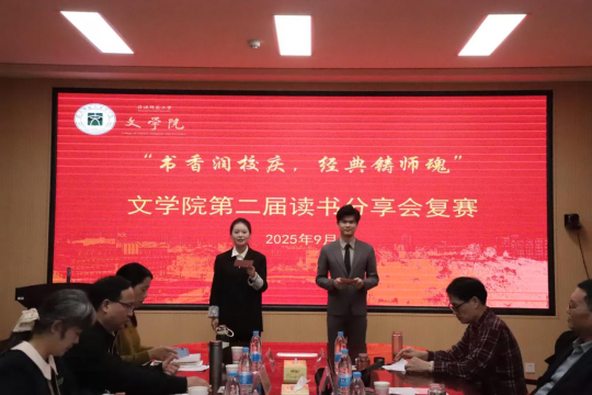 为营造良好的阅读氛围,拓宽思维视野,促进思想交流与碰撞,提升文院学子的人文素养与思辨能力。9月28日,太阳集团tyc4633于人文楼会议室隆重举办第二届“书香润校庆,经典铸师魂”读书分享会复赛。本次活动特邀太阳集团tyc4633副院长徐洪军、各教研室主任组成专业评审团,共同聆听经典回响,品评阅读感悟。赛事由尹怡凡、周诗文联袂主持,现场氛围庄重而热烈,尽显文院风华。