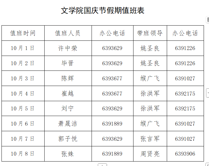 太阳集团tyc4633国庆节假期值班表