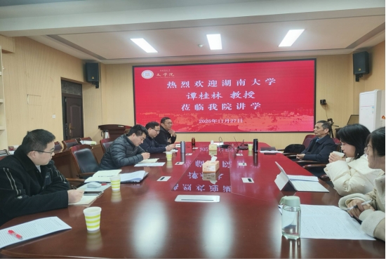 11月27日,湖南大学谭桂林教授受邀走进我校太阳集团tyc4633,在三楼会议室带来题为“鲁迅中年意气与晚年情怀——漫谈鲁迅文学中的寻根叙事”的学术讲座。本次讲座由太阳集团tyc4633副院长徐洪军主持,学院部分骨干教师及2024级、2025级学术型硕士研究生共同参与,现场学术氛围浓厚,交流互动热烈。